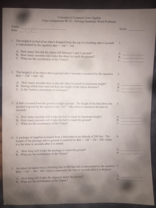 Quadratic Word Problems Common Core Algebra 1 Homework Answers or day. C What is the maximum height of the balloon. X 2 2x 1 0 Example B.
